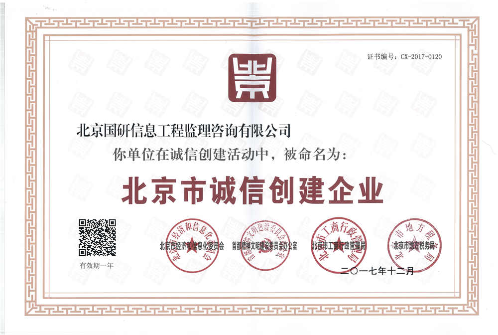 北京國(guó)研信息工程監(jiān)理咨詢(xún)有限公司獲“2017年北京市誠(chéng)信創(chuàng)建企業(yè)”榮譽(yù)稱(chēng)號(hào)